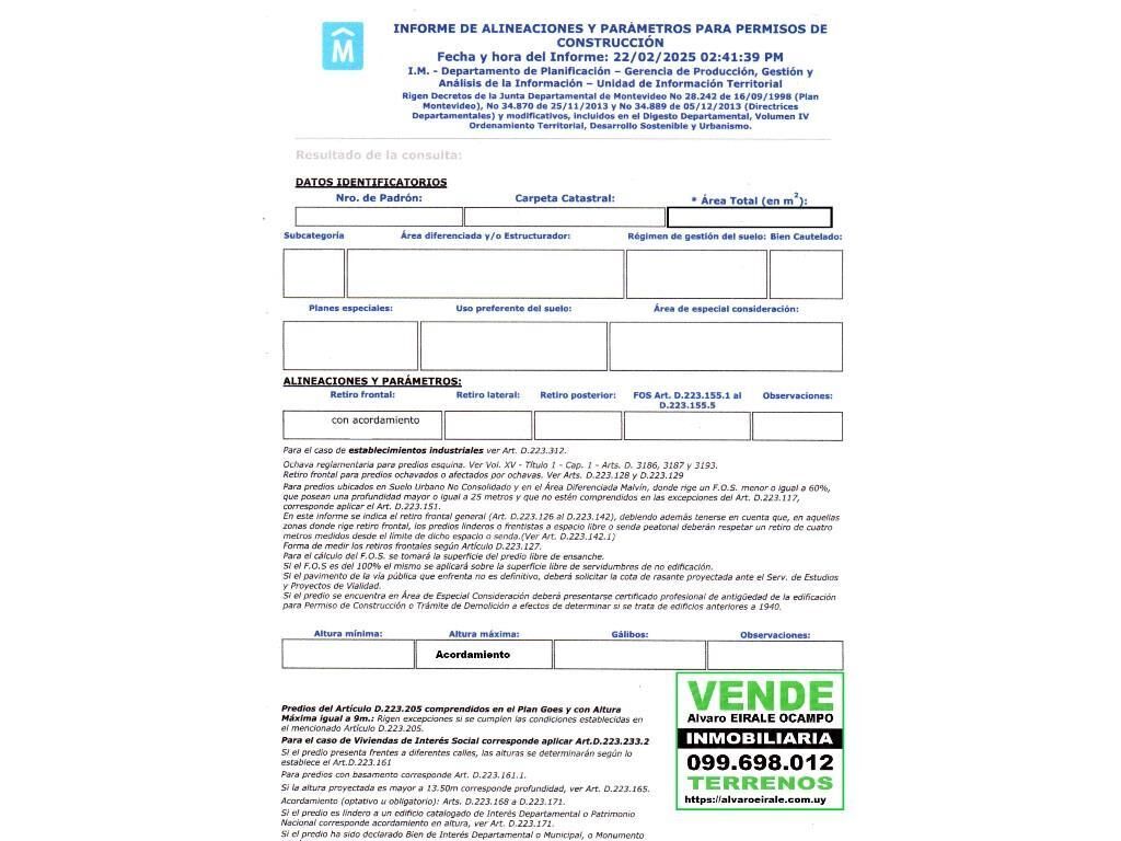 AEO*26673= PUNTA CARRETAS casi GOLF TERRENO 10.00 X 43.00= 433 m2 ALTURA PARA EDIFICAR 10 PISOS X ACORDAMIENTO. *VENDE INMOBILIARIA: Álvaro EIRALE OCAMPO (2025.TODOS los TERRENOS) 099.698.012 y 094.698.012 https://ALVAROEIRALE.COM.UY Servicios Inmobiliarios en Uruguay desde 1986. [email protected] Comisión Inmobiliaria 3 % + IVA RUT217892740016