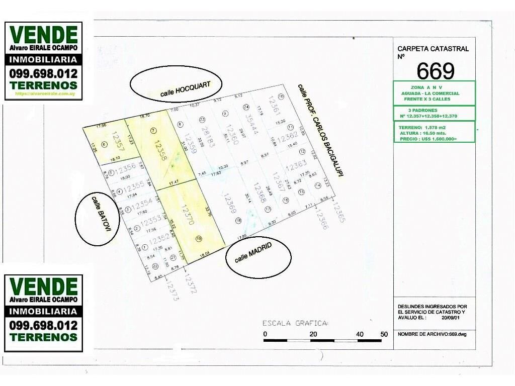 AEO*26415* ZONA A N V AGUADA - LA COMERCIAL HOCQUART y BATOVI y MADRID : TERRENO 1.578 m2 ESQUINA y con FRENTE X 3 CALLES . ZONA A N V para VIVIENDA PROMOVIDA . ALTURA 16.50 mts. * VENDE INMOBILIARIA Àlvaro EIRALE OCAMPO 099.698.012 y 094.698.012 (2025.TODOS los TERRENOS) SERVICIOS INMOBILIARIOS en URUGUAY desde 1986 https://alvaroeirale.com.uy [email protected] Comisión INMOBILIARIA 3 % + IVA RUT217892740016