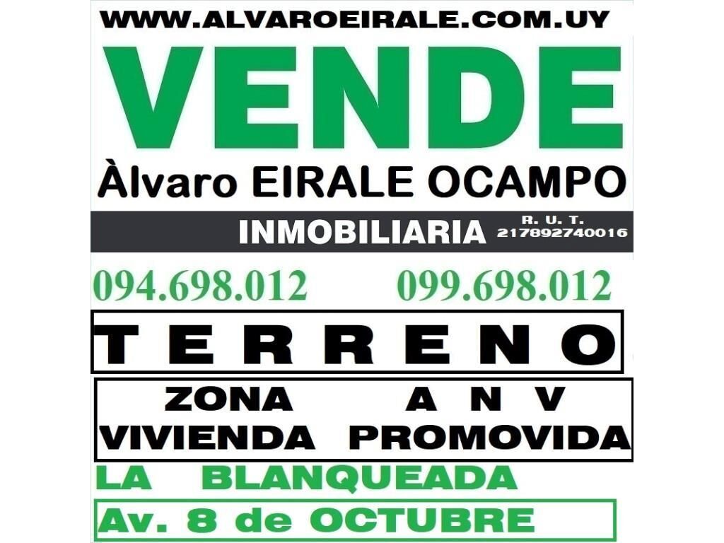 AEO*26017* ZONA A N V LA BLANQUEADA: Av. 8 de OCTUBRE y Av. L. A. HERRERA . ESPECTACULAR TERRENO de 1.800 m2. ALTURA 27 mts. GALIBO. FRENTE X 2 CALLES. ZONA A N V para VIVIENDA PROMOVIDA. *VENDE INMOBILIARIA Álvaro EIRALE OCAMPO (2025.TODOS los TERRENOS) 099.698.012 y 094.698.012 https://ALVAROEIRALE.COM.UY Servicios Inmobiliarios en Uruguay desde 1986. [email protected] Comisión Inmobiliaria 3 % + IVA RUT 217892740016