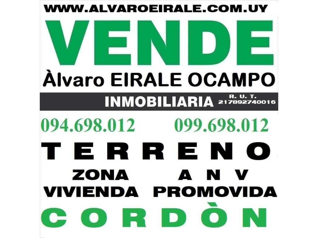 AEO*26029* ZONA A N V CORDÓN: MERCEDES y TRISTAN NARVAJA.TERRENO 12.00 X 45.00= 500 m2 ALTURA PARA EDIFICAR 27 mts. GALIBO. ZONA A N V para VIVIENDA PROMOVIDA. *VENDE INMOBILIARIA: Álvaro EIRALE OCAMPO 099.698.012 y 094.698.012 (2025.TODOS los TERRENOS ) Servicios Inmobiliarios en Uruguay desde 1986. [email protected] WWW.ALVAROEIRALE.COM.UY Comisión Inmobiliaria 3 % + I.V.A. R.U.T. 217892740016
