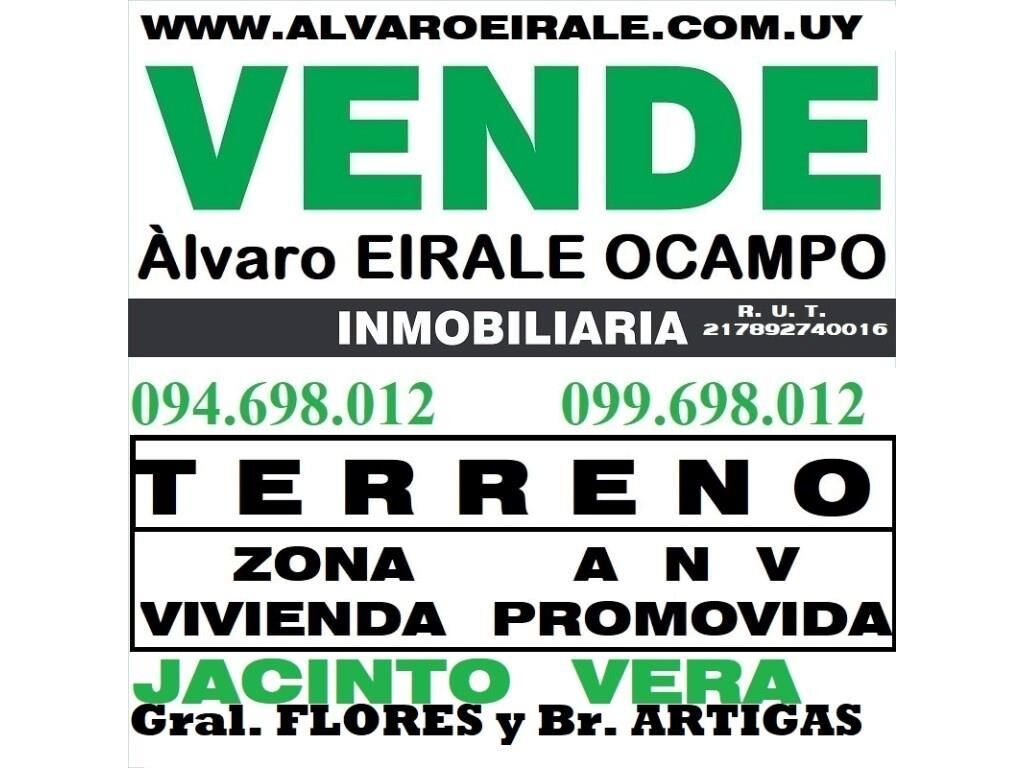 AEO*26329* ZONA A N V JACINTO VERA Gral. FLORES FABULOSO TERRENO ESQUINA 2.900 m2 CON FRENTE X 2 CALLES ZONA A N V PARA VIVIENDA PROMOVIDA. ALTURA PARA EDIFICAR 16.50 mts. * VENDE INMOBILIARIA: Álvaro EIRALE OCAMPO (2025.TODOS los TERRENOS) 099.698.012 y 094.698.012 https://ALVAROEIRALE.COM.UY Servicios Inmobiliarios en Uruguay desde 1986. [email protected] Comisión Inmobiliaria 3 % + IVA RUT217892740016