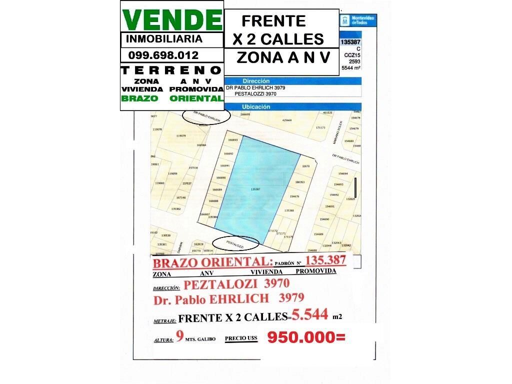 AEO*26729* ZONA A N V BRAZO ORIENTAL: PADRON ÙNICO Nº 135.387. PESTALOZZI 3970 Y ERLICH 3979 FRENTE X LAS 2 CALLES ESPECTACULAR TERRENO de 5.544 m2 con ESTRUCTURA. ZONA A N V para VIVIENDA PROMOVIDA *VENDE INMOBILIARIA Àlvaro EIRALE OCAMPO 099.698.012 y 094.698.012 (2025.TODOS los TERRENOS) Servicios Inmobiliarios en Uruguay desde 1986. https://alvaroeirale.com.uy COMISION 3 % + IVA RUT217892740016