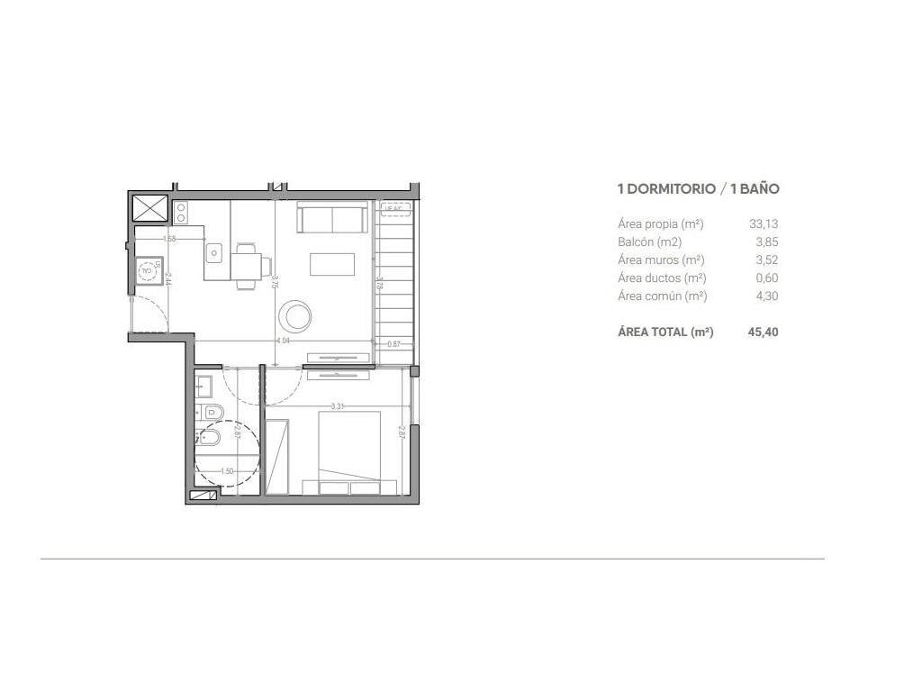 Apartamento de 1 dormitorio, 1 baño, living - comedor, cocina integrada y terraza. 45m2 en su totalidad.