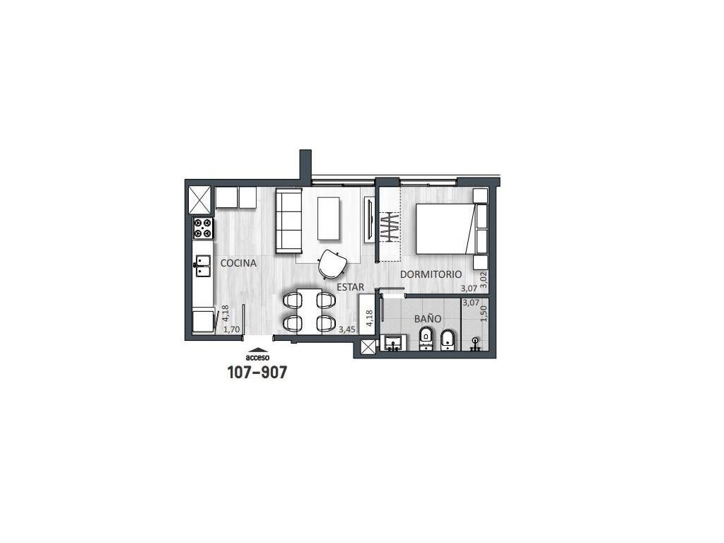 Unidad de 45m2 distribuidos en un dormitorio, cómodo living-comedor con cocina integrada y baño completo.