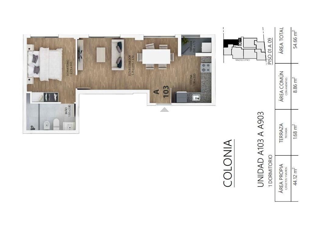 Apartamento de 54m2 distribuidos en un dormitorio con vestidor, living-comedor con cocina integrada y salida a terraza; y baño completo a USD 127000