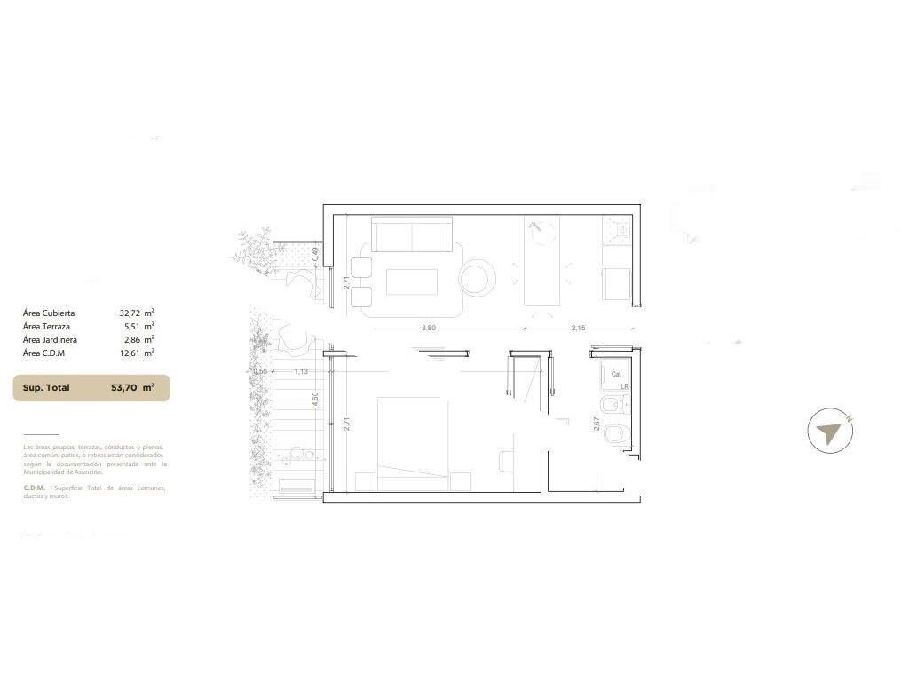 1 dormitorio en gran proyecto. 53.7m2 distribuidos en hermosos jardines y terrazas, un amplio dormitorio con vistas hacia el jardin, baño completo y còmo living-comedor con cocina integrada.