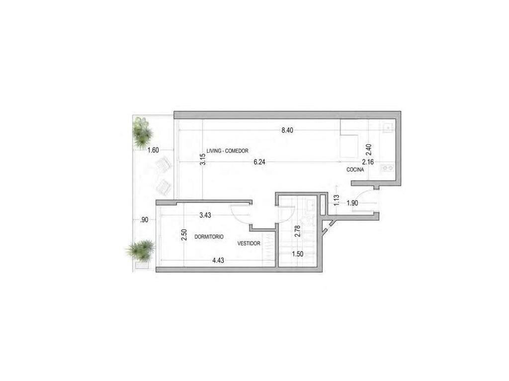 Apartamento de 58m2 distribuidos en un dormitorio, cocina integrada, living-comedor con acceso a terraza exclusiva y baño completo.