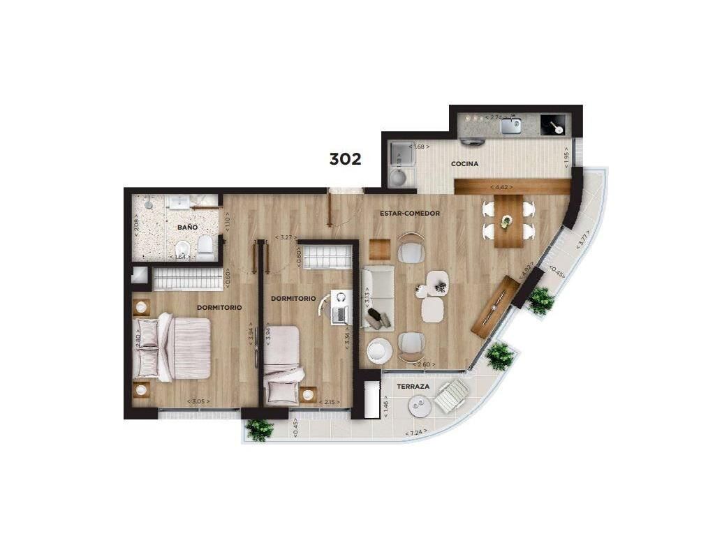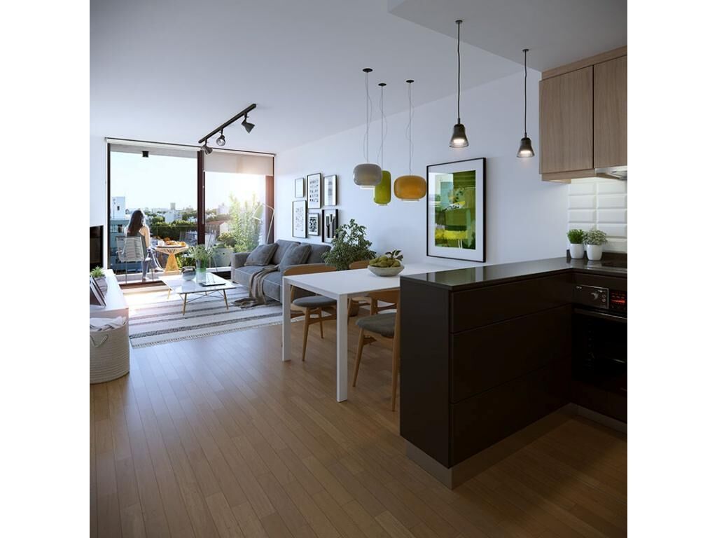 La unidad constará de 77m2 en los cuales cuenta con 2 dormitorios, un baño, terraza amplia y cocina definida con mesada de granito y muebles bajo mesada, con anafe vitrocerámico y campana, con previsión para horno eléctrico empotrado, además previsión para la instalación de aire acondicionado.