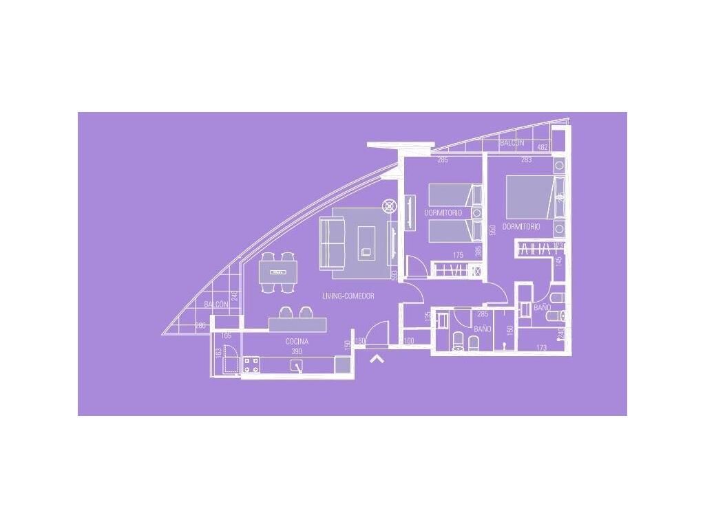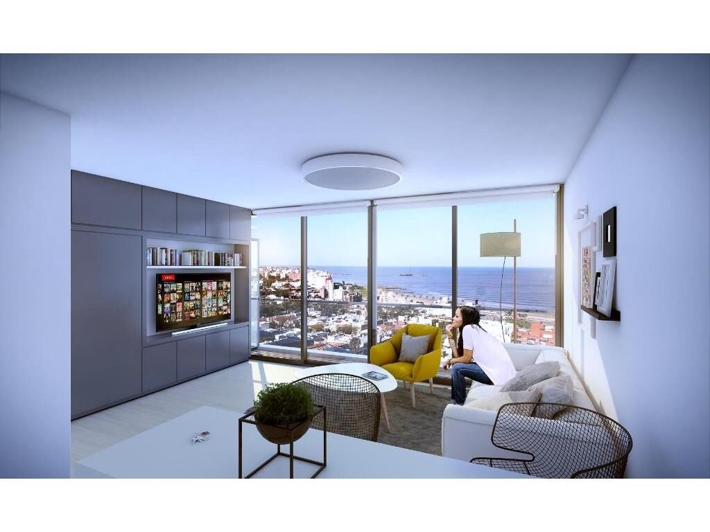 Apartamento de 2 dormitorios en piso alto con terraza, dos baños, living-comedor con cocina integrada.