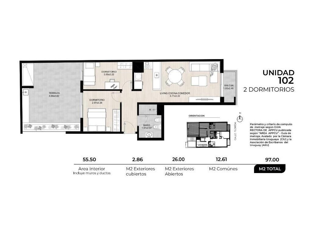 Unidad de dos dormitorios con excepcional terraza exclusiva. Cuenta con 97m2 distribuidos en dos cómodos dormitorios, living-comedor con cocina integrada y acceso a balcon hacia el frente. Completa con amplia terraza al fondo accesible desde ambos dormitorios y baño completo.