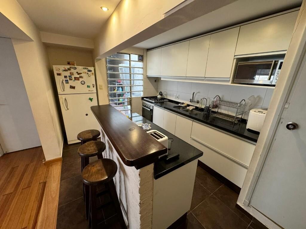 -              Cocina comedor con barra funcional, placares a medida, mesada, barra con butacas.