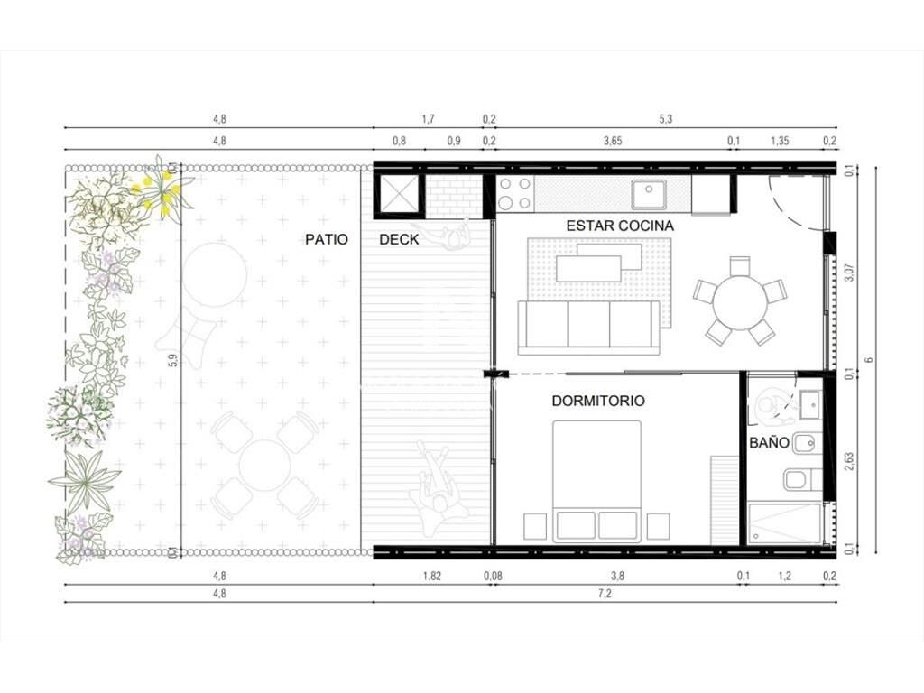 El espacio cuenta con un living comedor luminoso que se conecta a un amplio patio privado, ideal para disfrutar de reuniones al aire libre, leer un libro bajo el sol o simplemente relajarse en un entorno sereno. La cocina está bien equipada, lista para ser utilizada desde el primer día, complementando la practicidad y el confort que caracterizan al apartamento.