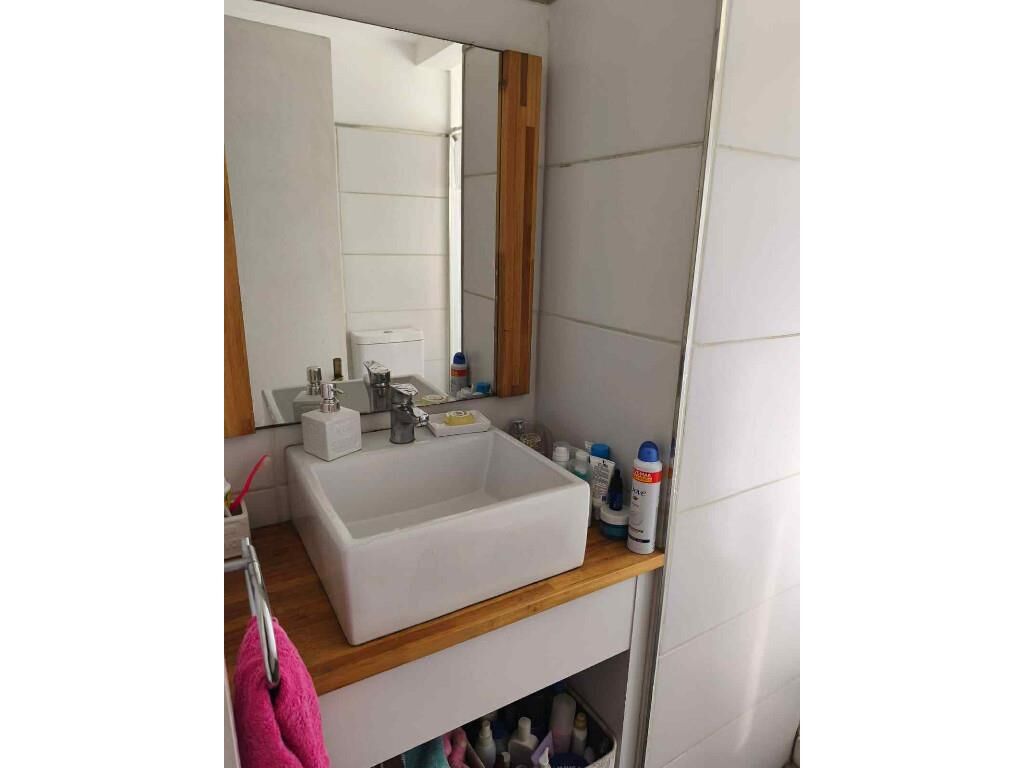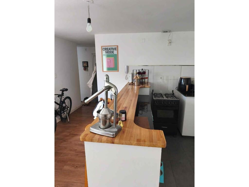 Cocina semi integrada con aéreos y bajo mesada, barra pasaplatos de madera, baño completo y cómodo.
