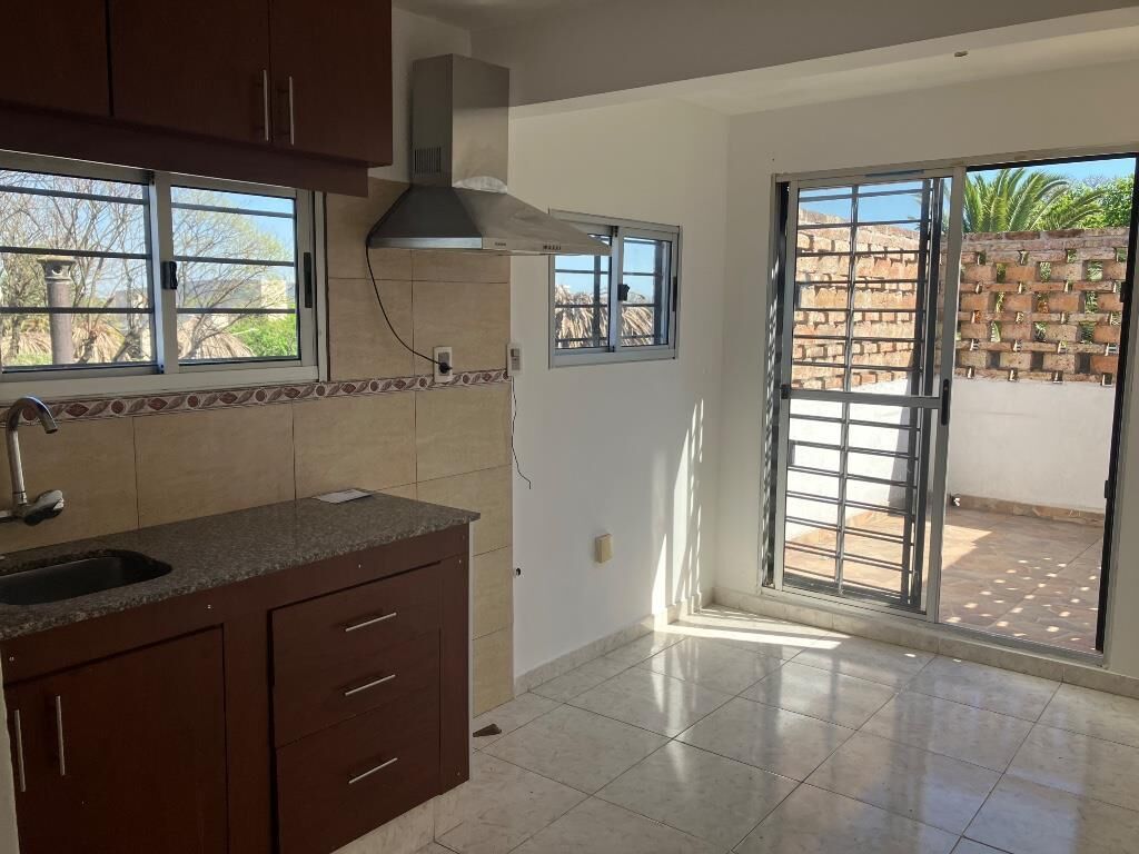Cocina comedor con muebles aéreos y bajo mesada, campana extractora,salida a terraza de uso exclusivo con nicho para lavadora.