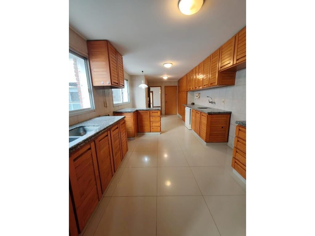 La unidad cuenta con un total de 257 m² (214 m² interiores y 43 m² de terrazas) distribuidos de manera funcional y luminosa. El amplio living comedor apaisado de 9 x 7 metros se abre a una gran terraza al frente, mientras que el estar definido se conecta con una segunda terraza que incluye parrillero. La cocina es de generosas dimensiones, equipada con doble mesada, antecocina, lavadero y servicio completo.