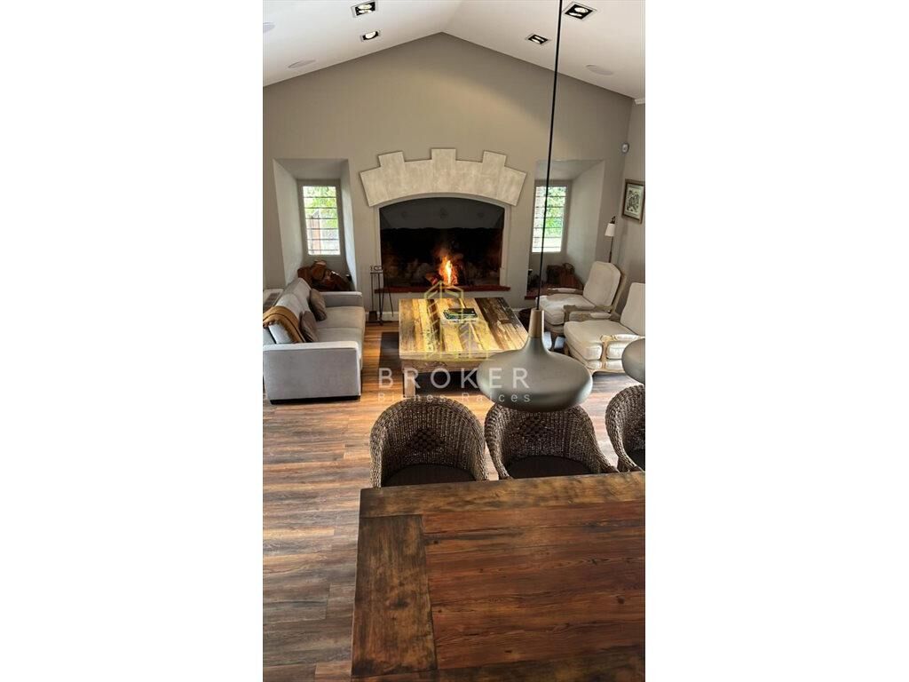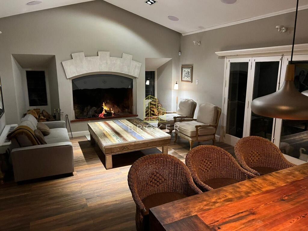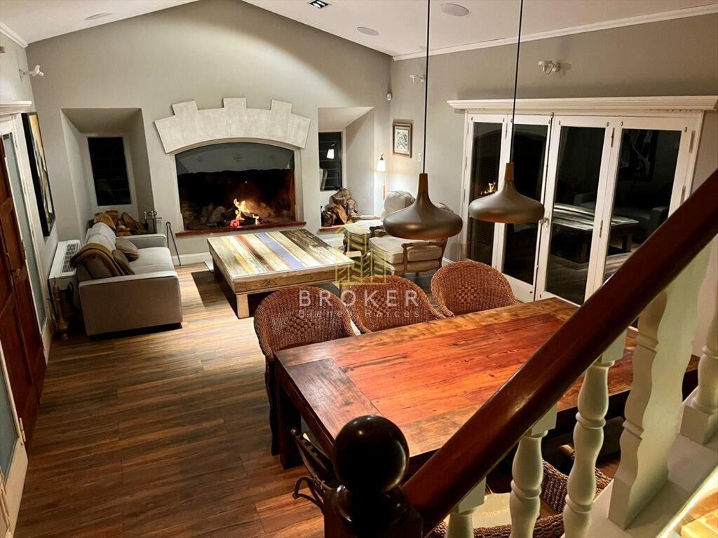 Living muy cómodo dividido en dos sectores: uno con mesa y sillas, y otro con un cálido espacio de home theater