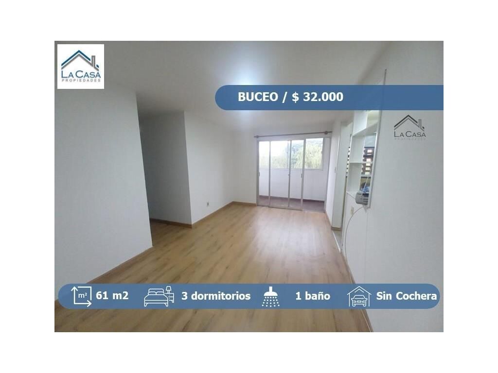 Santiago Rivas esq Mangaripe Apartamento de 3 dormitorios en buceo. 3 dormitorios con placar , ventanas y persianas. Baño completo con ducha higiénica. Cocina semi-integrada con muebles aéreos y bajo mesada. Living comedor con salida a terraza lavadero. 3er Piso por escalera.   Gastos comunes $ 1.300 Garantias: Contaduria , Anda, Porto Seguros Asesor : José 096500127 La Casa Propiedades - La opción inmobiliaria de Montevideo Dirección: Bv.España 2153 esq. Joaquin de Salterain Somos socios ADIU, Asociación de Agentes Inmobiliarios de Uruguay