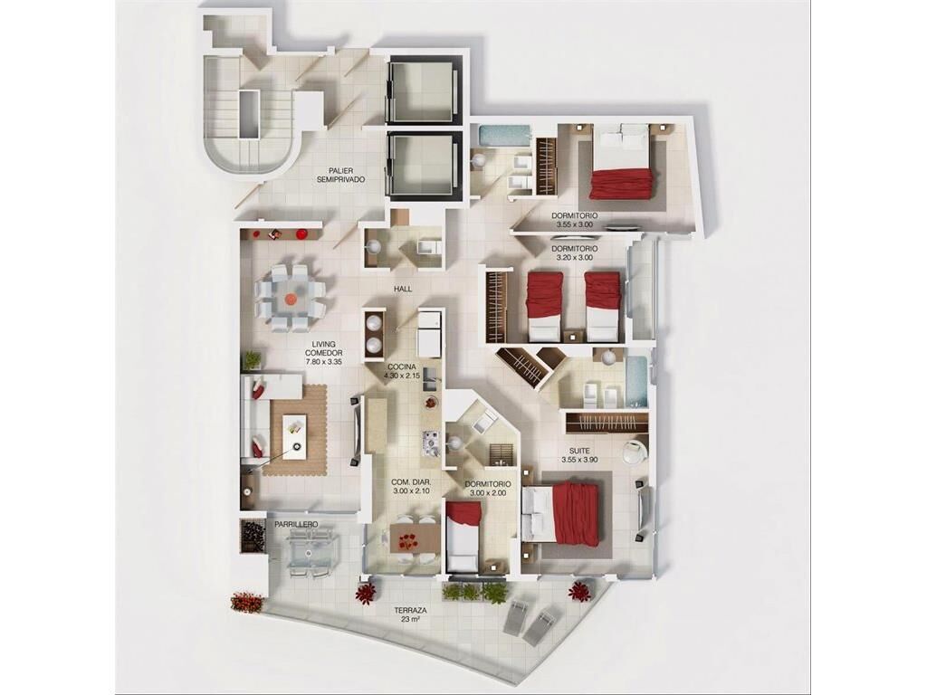 Apartamento de 3 dormitorios mas servicio, living-comedor, toilette y 3 baños, uno de ellos es suite, cocina definida, balcón con parrillero propio.