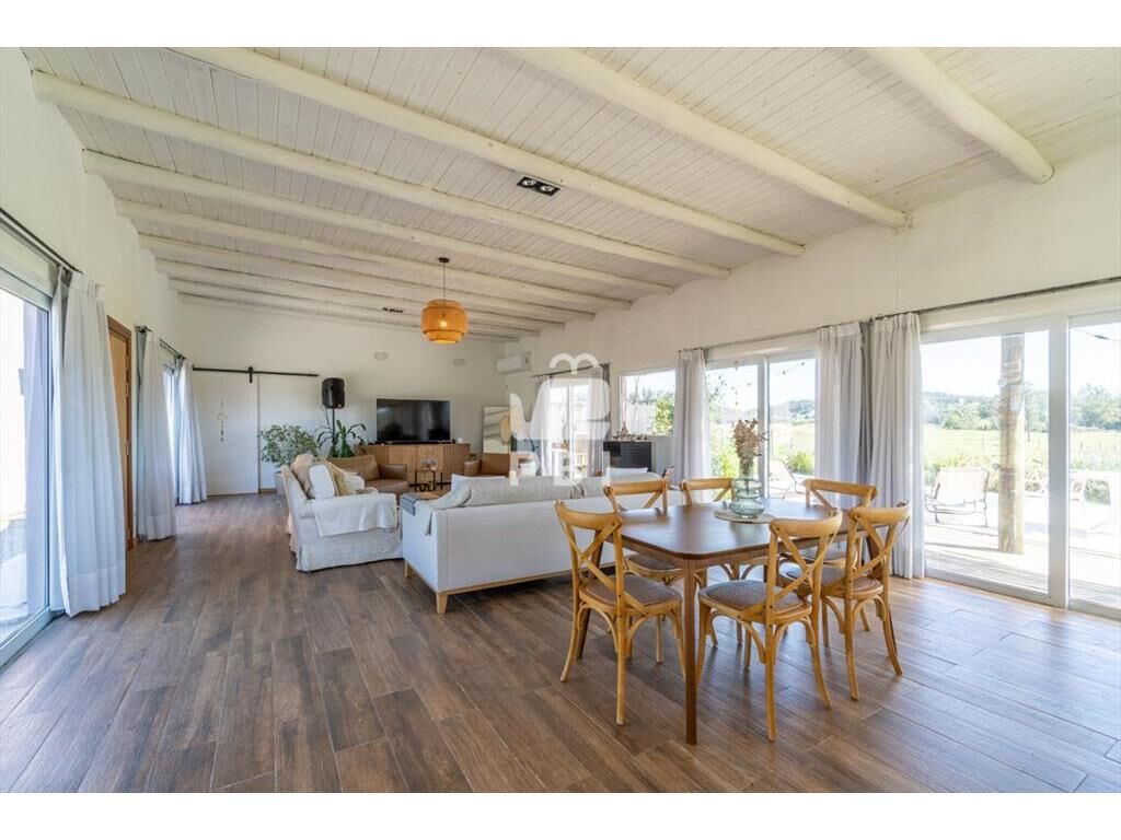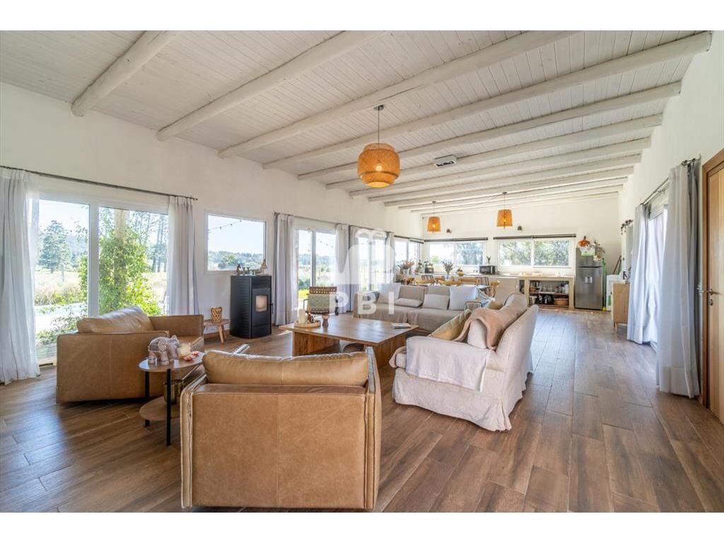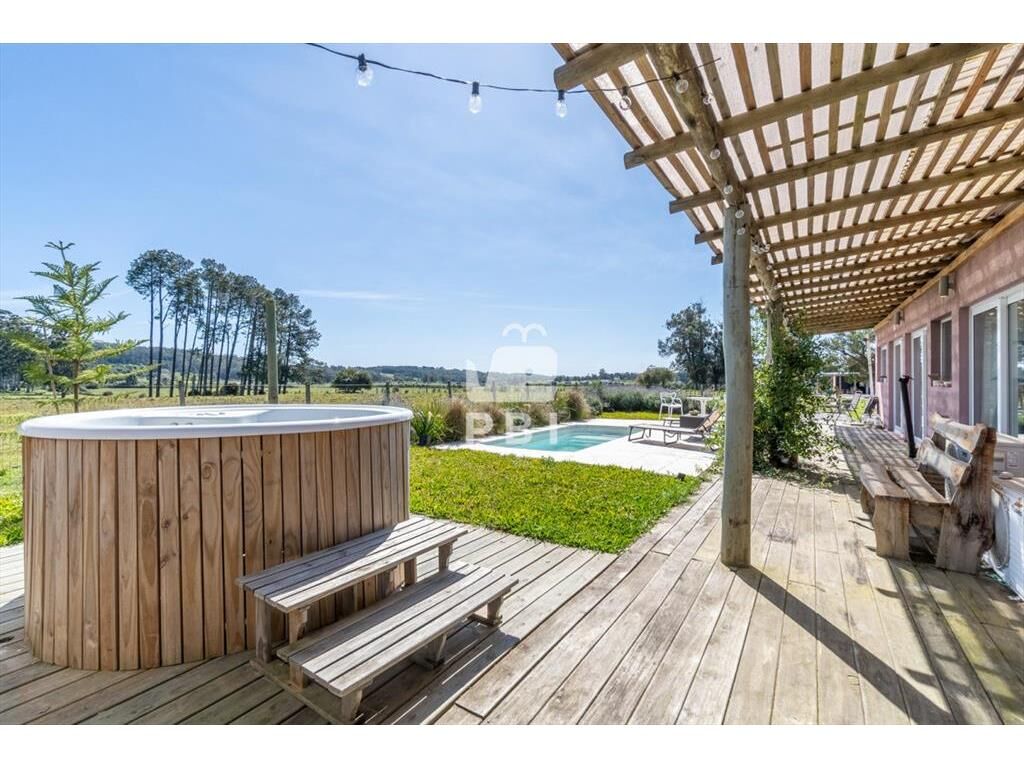 Cuenta con un living comedor y cocina amplio, con salida al exterior, que tiene piscina, quemador, mobiliario y jacuzzi con vista al bosque.