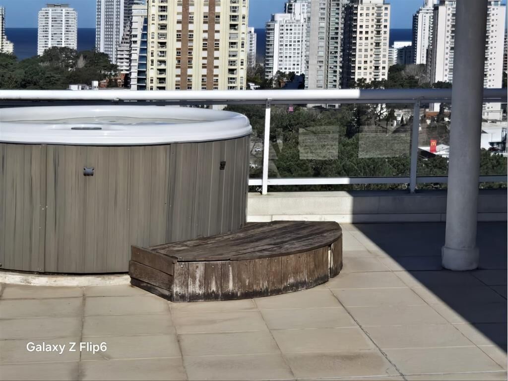 Acceso a terraza con parrillero y jacuzzi con escalera de caracol.