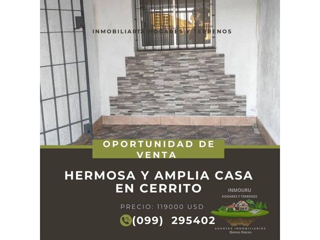 Vendo Amplia Casa ubicada en Cerrito en la calle Joaquín Artigas y Hum, al frente , cuenta con tres dormitorios amplios, living comedor, cocina defina, baño, patio con parrillero garaje con lugar para auto. (agua y luz independiente). Se encuentra alquilada.