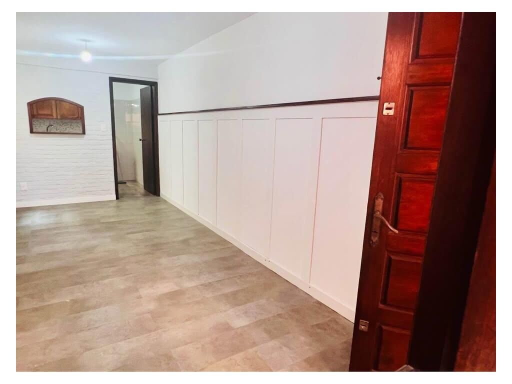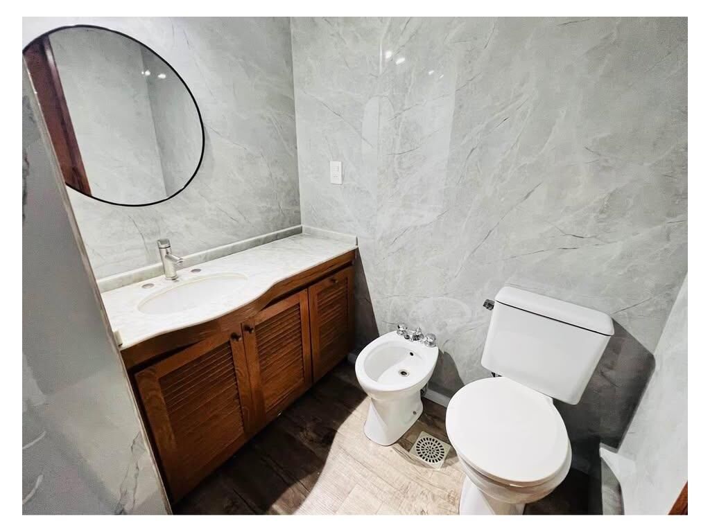La cocina está equipada con muebles aéreos y bajo mesada, pensada para aprovechar al máximo cada rincón, mientras que el baño fue reciclado y se presenta en impecable estado, con mueble bajo mesada que aporta comodidad. En el pasillo se encuentra un placard multiuso que resuelve necesidades de guardado extra. El living ofrece un ambiente cálido y moderno con pisos vinílicos y acent wall que aportan estilo y personalidad.