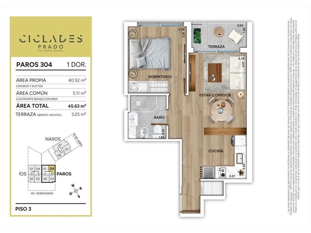 Cíclades Prado es un condominio de tres edificios de planta baja y tres pisos, (ÍOS, PAROS y NAXOS, implantado en un predio que atraviesa la manzana y le abre frente a dos avenidas icónicas del barrio: Av. Agraciada y Av. 19 de Abril.
