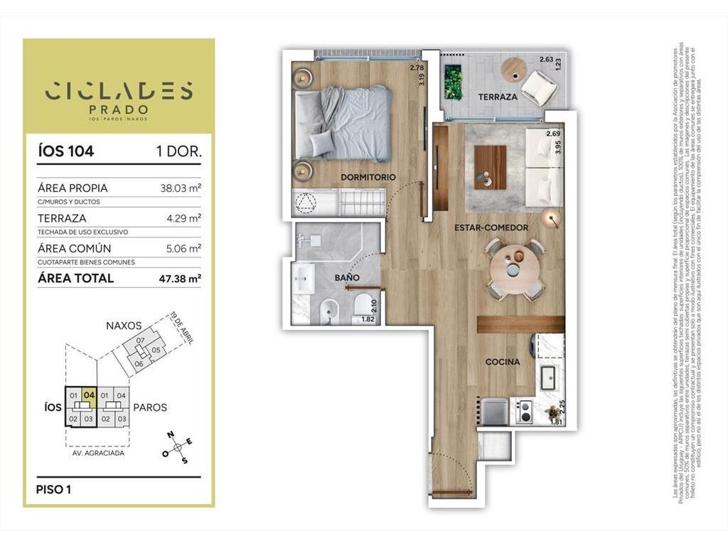 Cíclades Prado es un condominio de tres edificios de planta baja y tres pisos, (ÍOS, PAROS y NAXOS, implantado en un predio que atraviesa la manzana y le abre frente a dos avenidas icónicas del barrio: Av. Agraciada y Av. 19 de Abril.