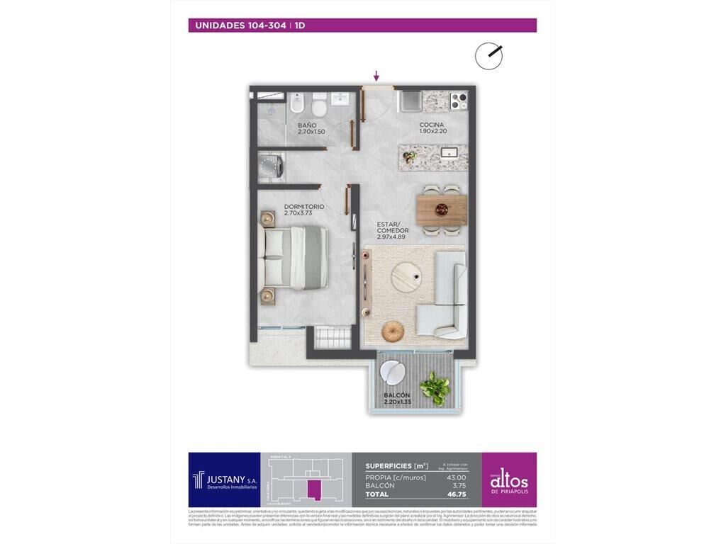 El apartamento cuenta con living comedor con acceso a balcón de uso exclusivo. Cocina integrada con mueble bajo mesada y aéreos. Un dormitorio con placard. Baño completo.