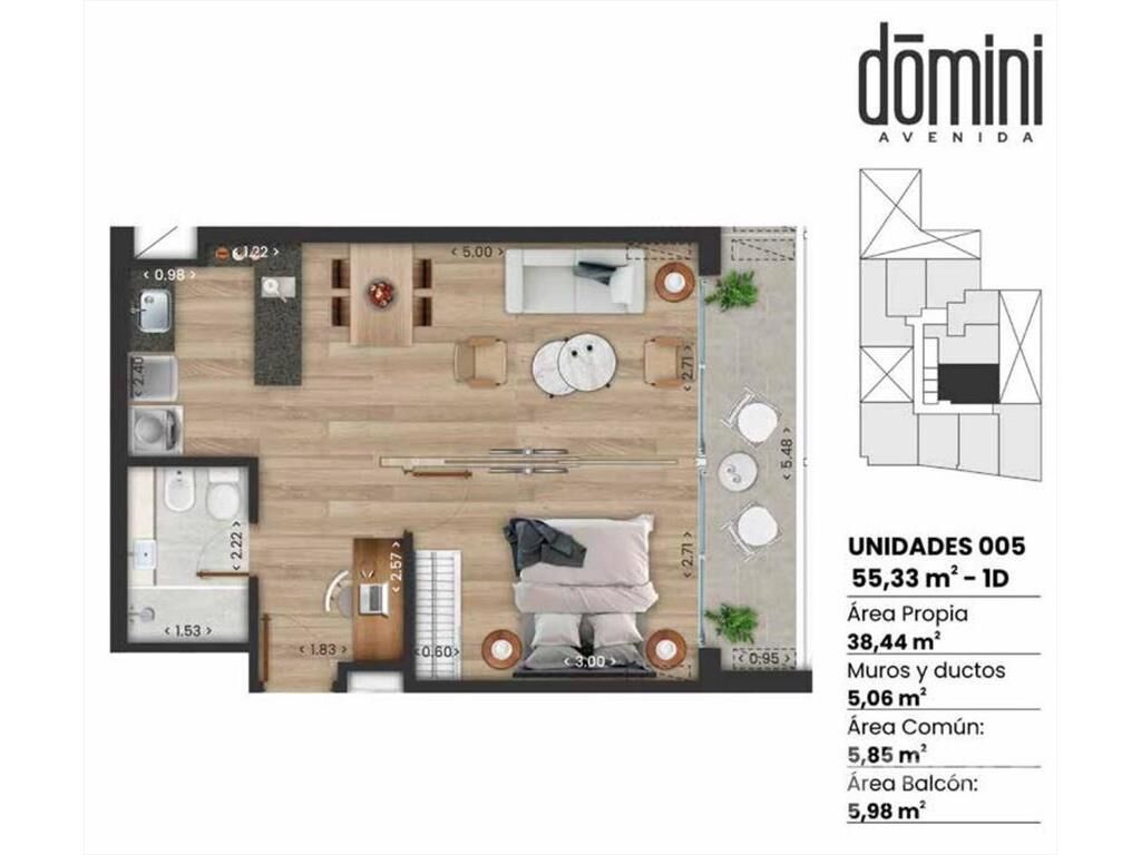 Venta de apartamento de 1 dormitorio en La Blanqueada El apartamento cuenta con: - Cocina Integrada por barra - Living Comedor  - Baño Completo - Terraza - 1 Dormitorio Domini Avenida está ubicado sobre uno de los principales conectores este-oeste de Montevideo, a mitad de camino entre el Centro y Carrasco. Muy cerca de los Shoppings e hipermercados más importantes de la ciudad, como también de los principales centros de salud del país. La cercanía al Parque Batlle completa esta excelente ubicación y equilibra la convivencia urbana con la naturaleza de uno de los grandes pulmones verdes de la ciudad. -109 apartamentos -59 cocheras -Bicicletero -Laundry -Gimnasio -Playroom -2 Barbacoas/Parrillas -2 Terrazas Lounge -Local Comercial Cochera opcional desde U$S 18.000 Comisión inmobiliaria: 3% + IVA Gastos de Ocupación: 4% Fondo de reserva: 0.25% OPCIONES DE PAGO: Durante Obra: 10% reserva, 20% compromiso, 60% durante obra, 10% ocupación Financiamiento con banco: 5% reserva, 5% compromiso, 10% durante obra, 80% ocupación. INMOBILIARIA GOLF Afiliados a Cámara Inmobiliaria Uruguaya