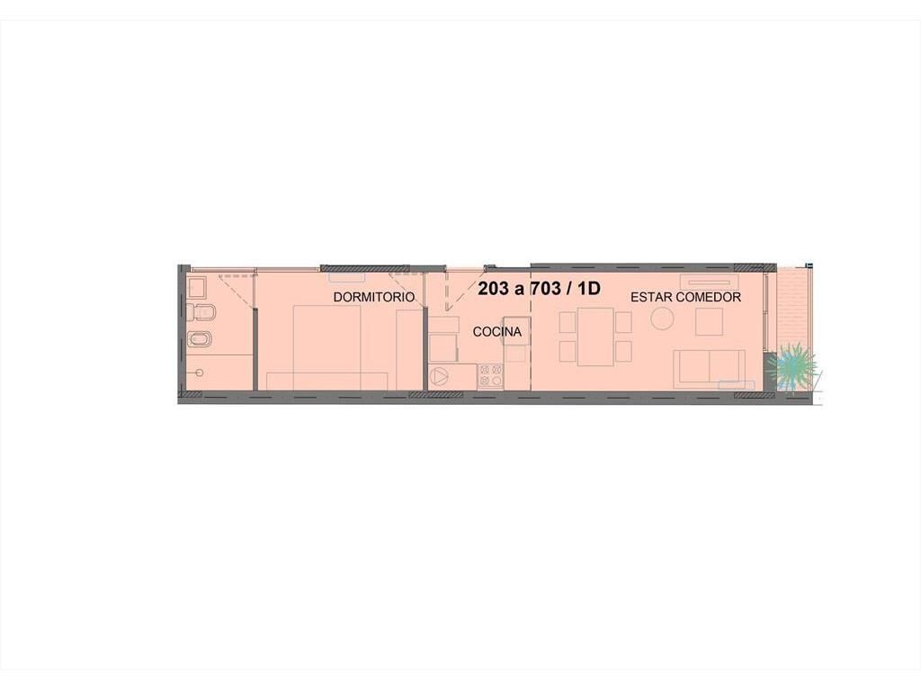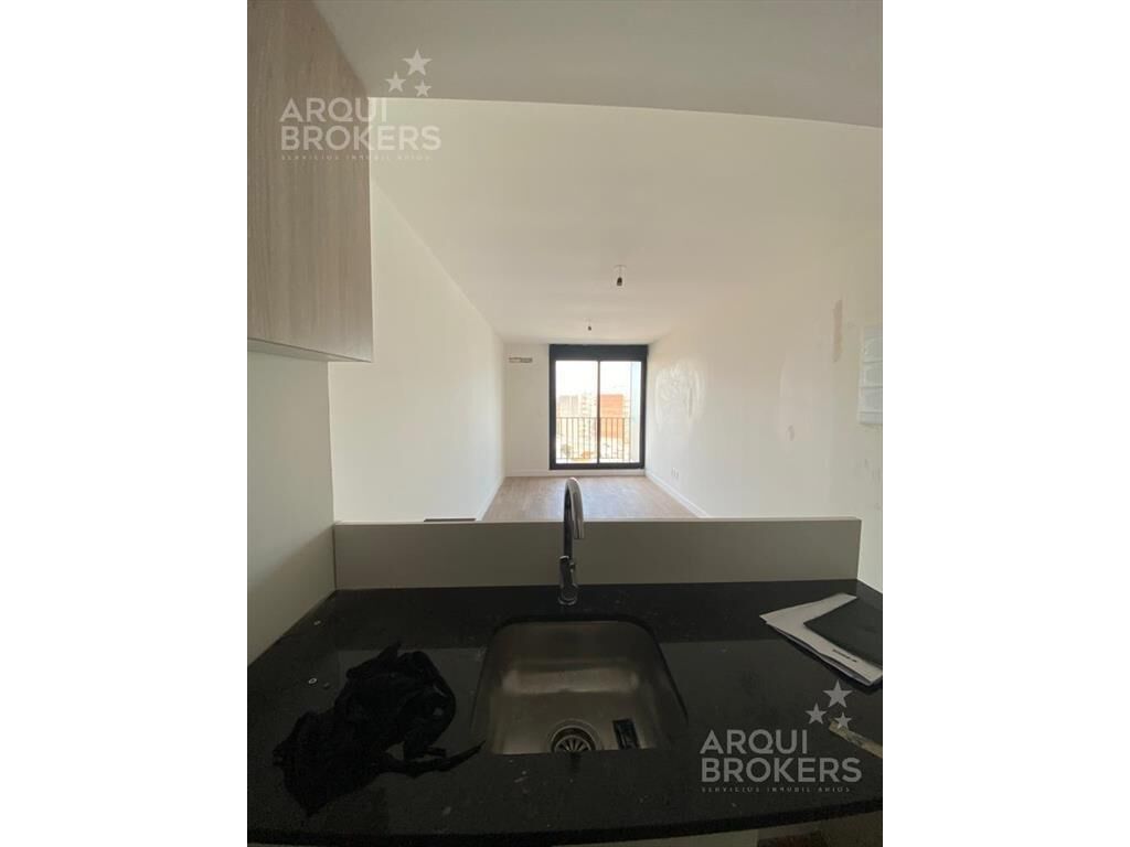 Living comedor con terraza al contrafrente, cocina integrada, 1 dormitorio y 1 baño.