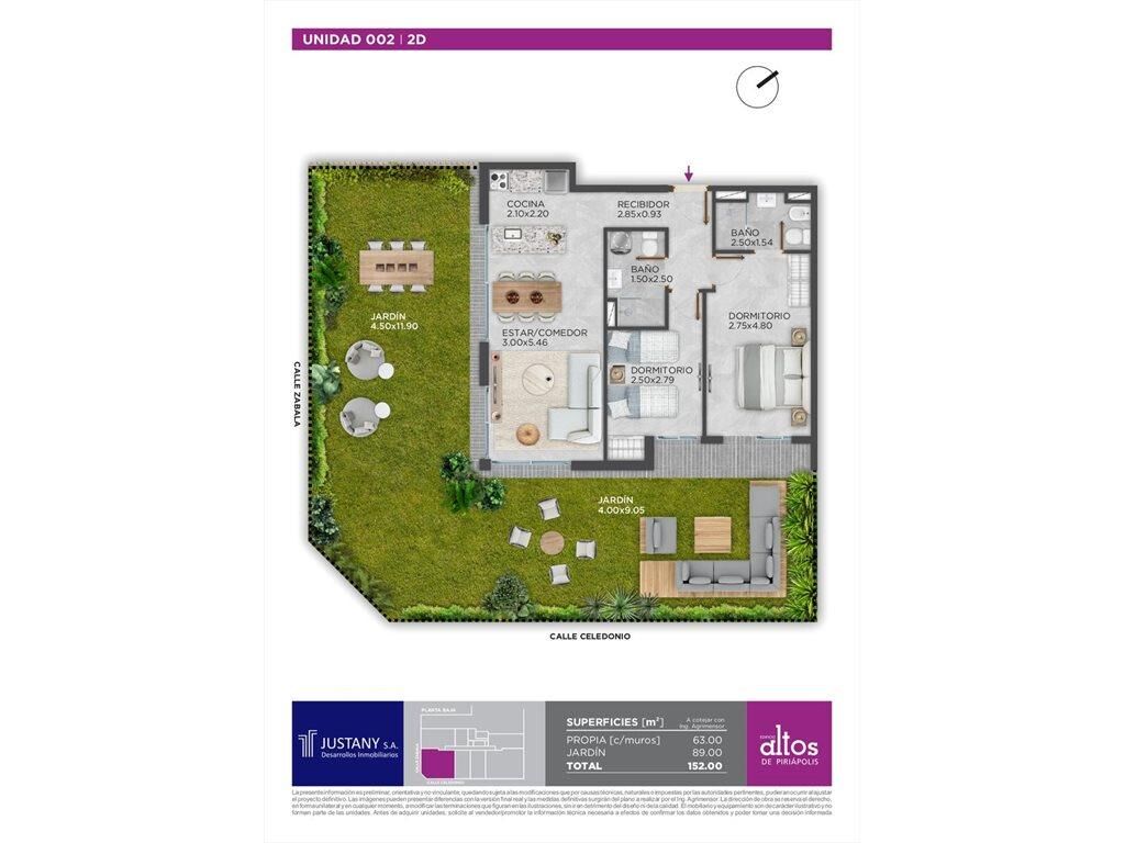 El apartamento cuenta con living comedor con acceso a amplio patio de uso exclusivo de 89 mt2. Cocina integrada con mueble bajo mesada y aéreos.