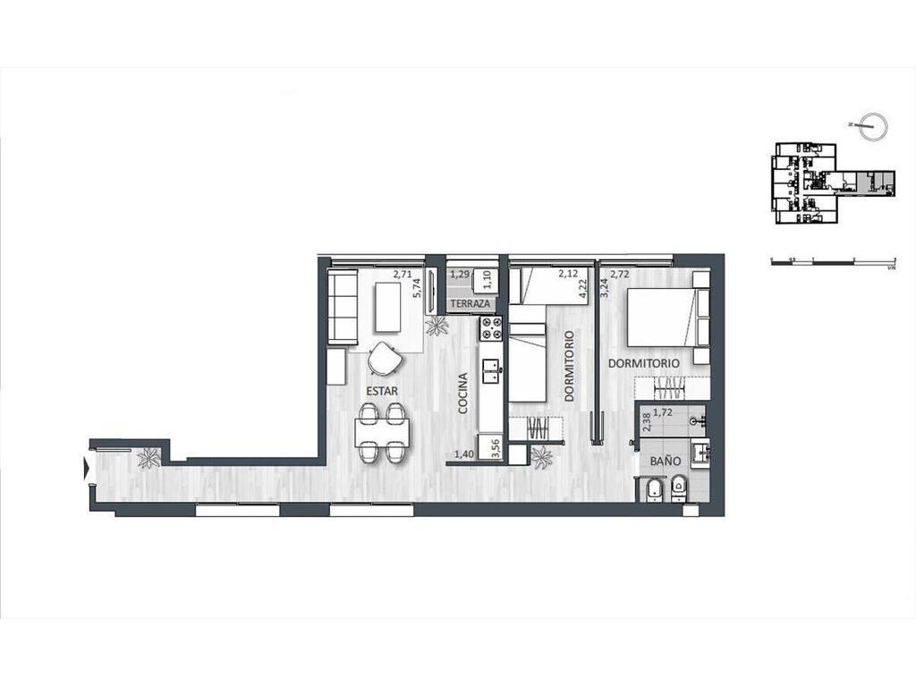 Living comedor con cocina integrada, terraza lavadero, 2 dormitorios y 1 baño completo.