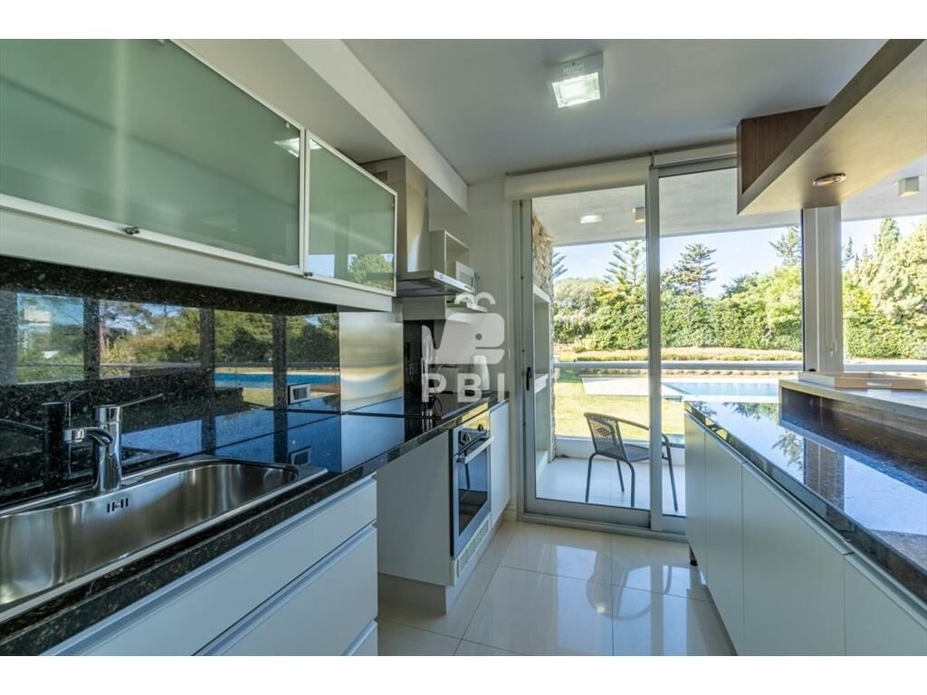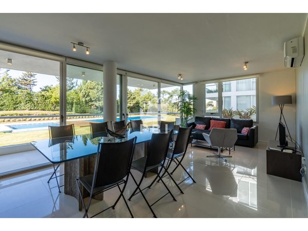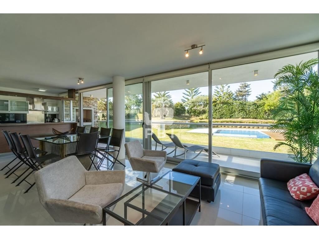 Hermoso living comedor con vista a la piscina, cocina definida con barra.
