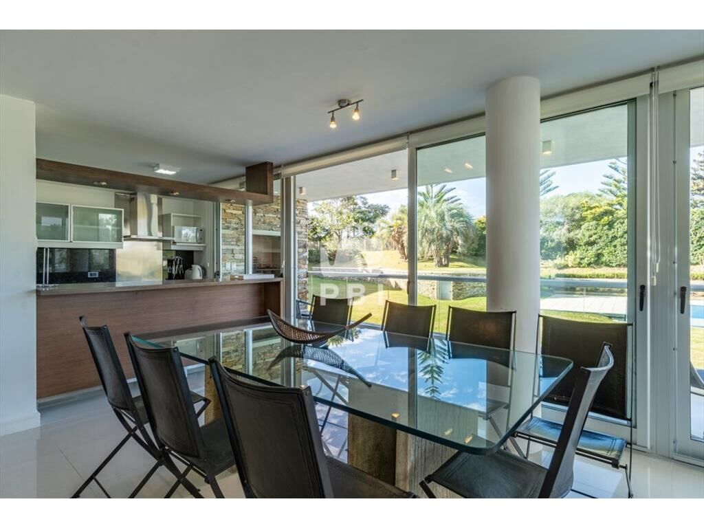 Hermoso living comedor con vista a la piscina, cocina definida con barra.