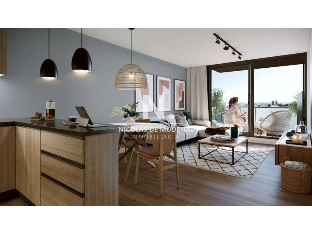 Cocina amplia, que se integra al Living Comedor de gran espacio, con vista al balcón.