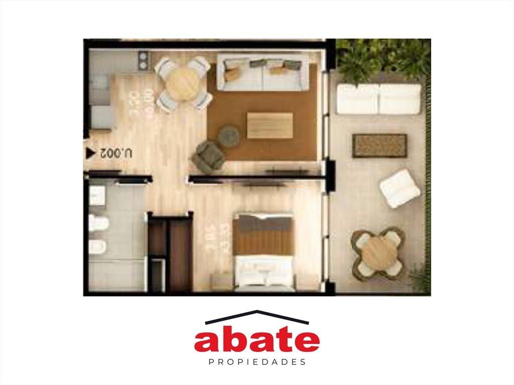 La unidad cuenta con living comedor con cocina integrada que se extiende a un amplio patio de 16 metros cuadrados al frente.