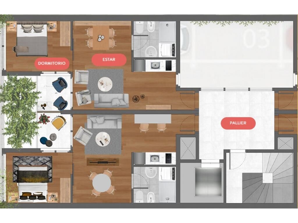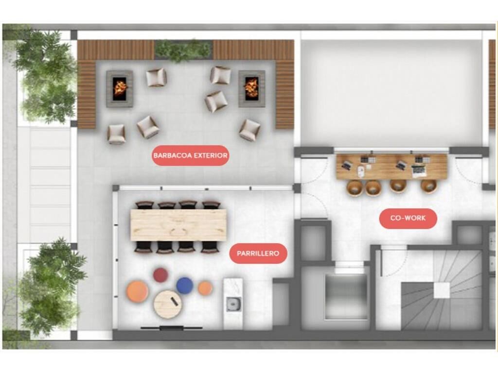 - Espacios de co-living, co-working, gimnasio y solarium con reposeras.