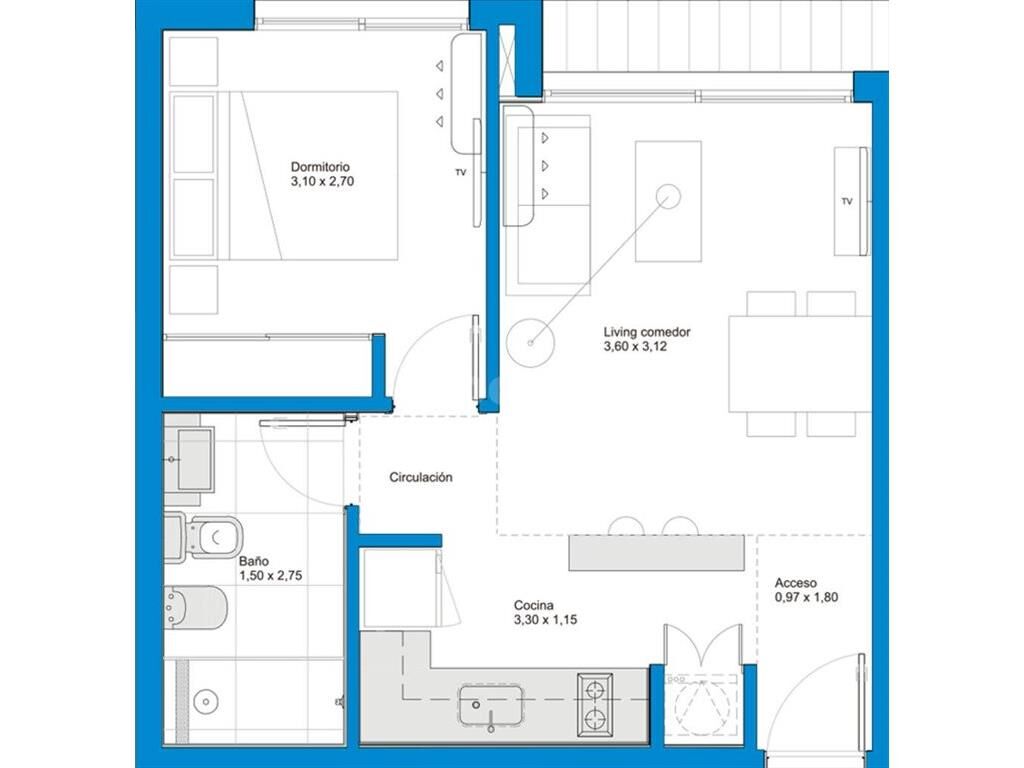 Se desarrolla: Living - comedor con cocina integrada con barra, anafe y horno empotrado. Del living se accede a la terraza balcón con vista a la calle Colombes.