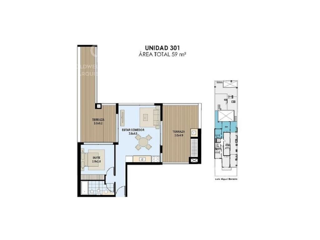 Living comedor con cocina integrada con salida a amplias terrazas con parrillero individual, 1 dormitorio con placard y 1 baño completo.