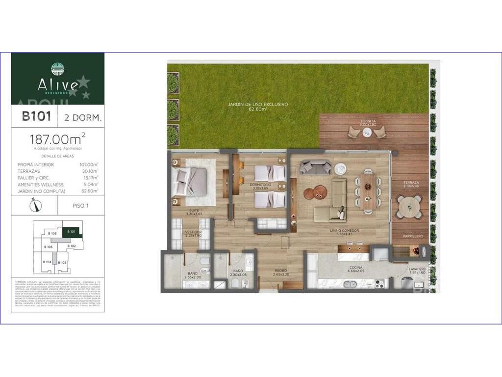 Apartamento de 2 dormitorios en alquiler en Carrasco Norte. Piso 1 torre B. Living comedor con terraza al frente con parrillero y jardín de 63m2, cocina definida con placares y terraza lavadero, 2 dormitorios, 1 en suite con vestidor, 2 baños completos. Cuenta con garaje y bahulera. Calefacción por losa radiante individual con caldereta a gas. Cuenta con equipamiento Parcial que incluye: Mampara y espejo en los baños, Cortinas en todo el apartamento, Campana, Horno, Anafe, Aire acondicionado con ductos y Luminarias. Alive cuenta con: Piscina interior de 8 x 8 mts., hidromasaje de 4.30 x 5 mts., circuito de hidroterapia terapéutico, sala de masajes, sauna seco, sala de gimnasia, estiramiento y meditación, sala de relax, sala de estar, sala de juegos, 2 barbacoas completas equipadas para 20 servicios cada una, gimnasio de vanguardia, vestuarios masculinos y femeninos, sala de reuniones, consultorio médico. alive Path. Camino de contraste térmico. uB101 Ref. RO Referencia: ABU57385 AP7134641 Honorarios por intermediación: 3% + IVA para operaciones de compra. Un mes de alquiler + IVA para operaciones de alquiler. La información contenida en el presente documento ha sido proporcionada íntegramente por el/los propietarios del inmueble. Arquibrokers Servicios Inmobiliarios no se responsabiliza por las diferencias ni las modificaciones que puedan surgir a partir de este documento.