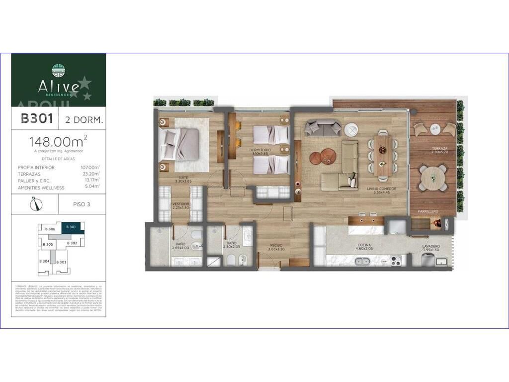 Apartamento de 2 dormitorios en alquiler en Carrasco Norte. Piso 3 torre B. Living comedor con terraza al frente con parrillero, cocina definida con placares y terraza lavadero, 2 dormitorios, 1 en suite con vestidor, 2 baños completos. Cuenta con garaje y bahulera. Calefacción por losa radiante individual con caldereta a gas. Cuenta con equipamiento Parcial que incluye: Mampara y espejo en los baños, Cortinas en todo el apartamento, Campana, Horno, Anafe, Aire acondicionado con ductos y Luminarias. Alive cuenta con: Piscina interior de 8 x 8 mts., hidromasaje de 4.30 x 5 mts., circuito de hidroterapia terapéutico, sala de masajes, sauna seco, sala de gimnasia, estiramiento y meditación, sala de relax, sala de estar, sala de juegos, 2 barbacoas completas equipadas para 20 servicios cada una, gimnasio de vanguardia, vestuarios masculinos y femeninos, sala de reuniones, consultorio médico. alive Path. Camino de contraste térmico. uB301 Ref. RO Referencia: ABU57385 AP7134656 Honorarios por intermediación: 3% + IVA para operaciones de compra. Un mes de alquiler + IVA para operaciones de alquiler. La información contenida en el presente documento ha sido proporcionada íntegramente por el/los propietarios del inmueble. Arquibrokers Servicios Inmobiliarios no se responsabiliza por las diferencias ni las modificaciones que puedan surgir a partir de este documento.
