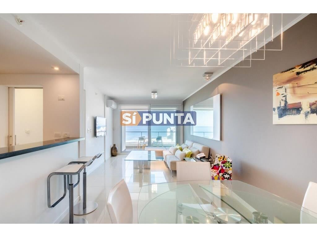 Excelente planta, con espacios amplios y luminosos, piso alto, con muy buena vista al mar de Playa Brava y a los atardeceres de la Mansa. Dispone de dos dormitorios, el principal en suite con vestidor, dos baños completos. Living comedor con extenso balcón mirando hacia el mar. Cocina bien equipada con barra-desayunador.