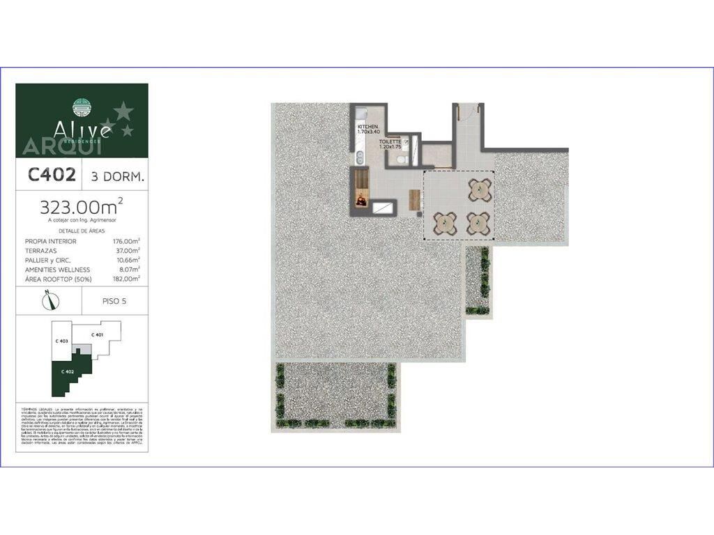 Ubicado en el corazón del barrio PARQUES, rodeado de amplios espacios verdes y con acceso por tres calles. El conjunto esta integrado por 3 edificios de 4 plantas. A estrenar en diciembre de 2025. Apartamento de 3 dormitorios en alquiler en Carrasco. Piso 4 torre C con orientación oeste. Living comedor con terraza al frente con parrillero, cocina definida con placares y terraza lavadero, 3 dormitorios en suite, 2 con vestidor, 3 baños completos y 1 baño social. Cuenta con garaje y bahulera. además cuenta con Rooftop de 364m2. Calefacción por losa radiante individual con caldereta a gas. Cuenta con equipamiento parcial que incluye: mampara y espejo en los baños, cortinas en todo el apartamento, campana, horno, anafe, aire acondicionado con ductos, luminarias en todo el apartamento. El precio de alquiler incluye Garaje y Baulera Alive cuenta con: Piscina interior de 8 x 8 mts., hidromasaje de 4.30 x 5 mts., circuito de hidroterapia terapéutico, sala de masajes, sauna seco, sala de gimnasia, estiramiento y meditación, sala de relax, sala de estar, sala de juegos, 2 barbacoas completas equipadas para 20 servicios cada una, gimnasio de vanguardia, vestuarios masculinos y femeninos, sala de reuniones, consultorio médico. alive Path. Camino de contraste térmico. Gastos de ocupación incluidos en el precio. uC402 Alive Ref. RO Referencia: ABU57385 AP7356446 Honorarios por intermediación: 3% + IVA para operaciones de compra. Un mes de alquiler + IVA para operaciones de alquiler. La información contenida en el presente documento ha sido proporcionada íntegramente por el/los propietarios del inmueble. Arquibrokers Servicios Inmobiliarios no se responsabiliza por las diferencias ni las modificaciones que puedan surgir a partir de este documento.
