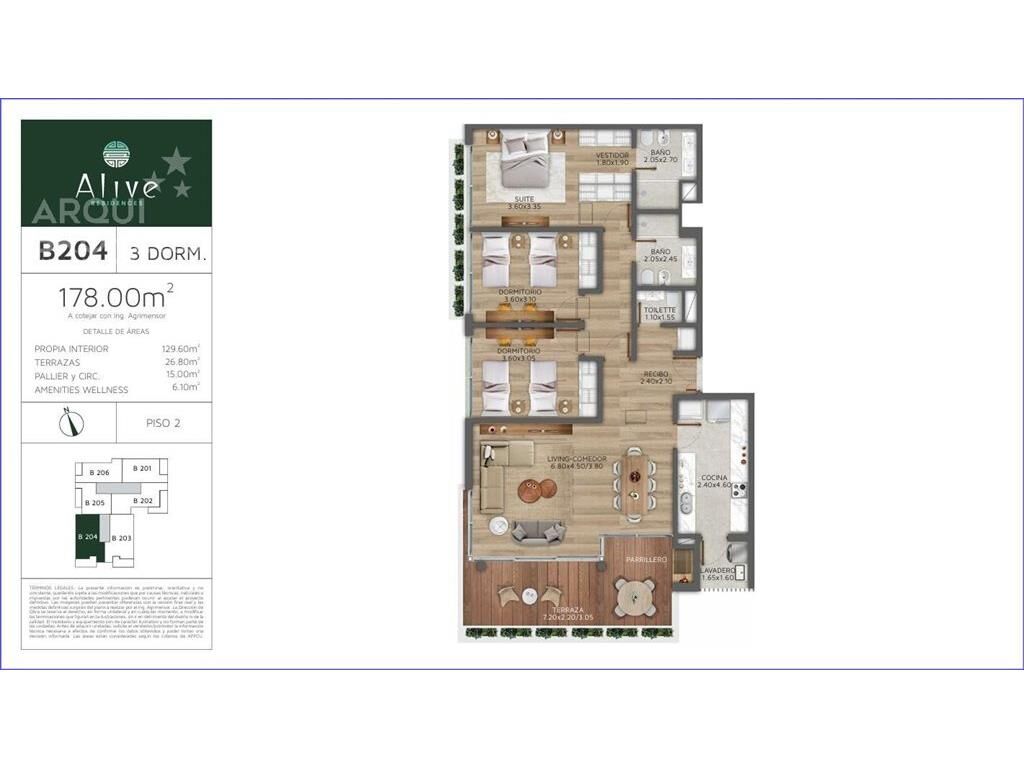 Apartamento de 3 dormitorios en alquiler en Carrasco Norte. Piso 2 torre B con orientación oeste. Living comedor con terraza al frente con parrillero, cocina definida con placares y terraza lavadero, 3 dormitorios, 1 en suite con vestidor, 2 baños completos y 1 baño social. Cuenta con garaje y bahulera. Calefacción por losa radiante individual con caldereta a gas. Cuenta con equipamiento Parcial que incluye: Mampara y espejo en los baños, Cortinas en todo el apartamento, Campana, Horno, Anafe, Aire acondicionado con ductos y Luminarias. Alive cuenta con: Piscina interior de 8 x 8 mts., hidromasaje de 4.30 x 5 mts., circuito de hidroterapia terapéutico, sala de masajes, sauna seco, sala de gimnasia, estiramiento y meditación, sala de relax, sala de estar, sala de juegos, 2 barbacoas completas equipadas para 20 servicios cada una, gimnasio de vanguardia, vestuarios masculinos y femeninos, sala de reuniones, consultorio médico. alive Path. Camino de contraste térmico. Gastos de ocupación incluidos en el precio. uB204 Ref. RO Referencia: ABU57385 AP7136445 Honorarios por intermediación: 3% + IVA para operaciones de compra. Un mes de alquiler + IVA para operaciones de alquiler. La información contenida en el presente documento ha sido proporcionada íntegramente por el/los propietarios del inmueble. Arquibrokers Servicios Inmobiliarios no se responsabiliza por las diferencias ni las modificaciones que puedan surgir a partir de este documento.