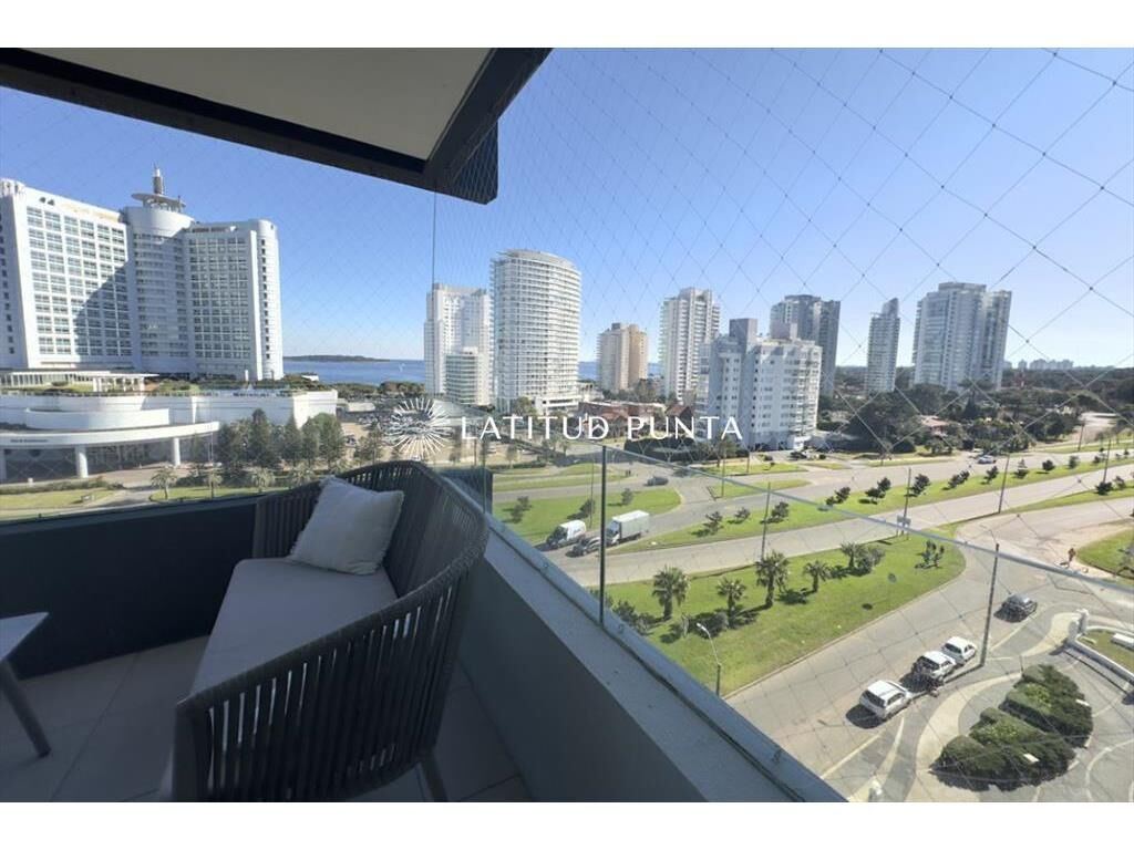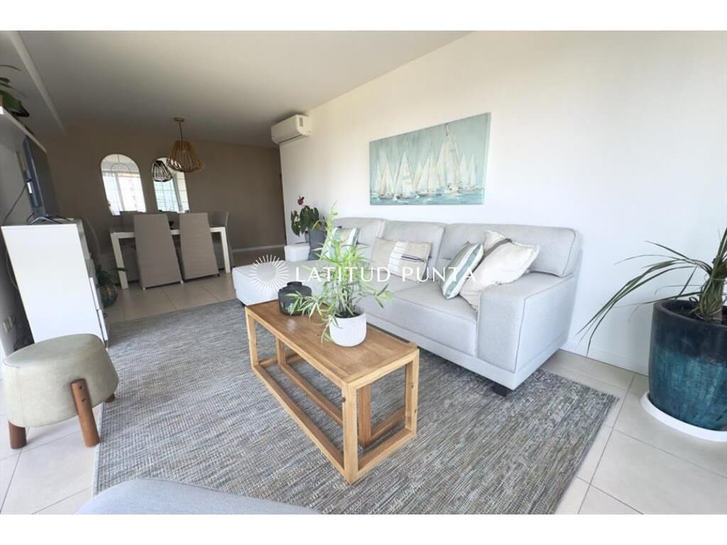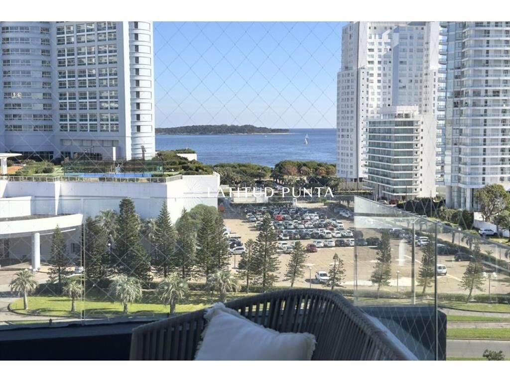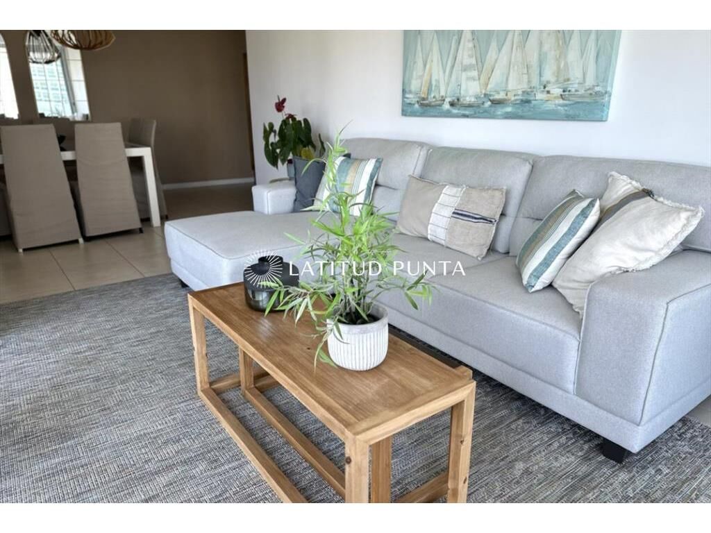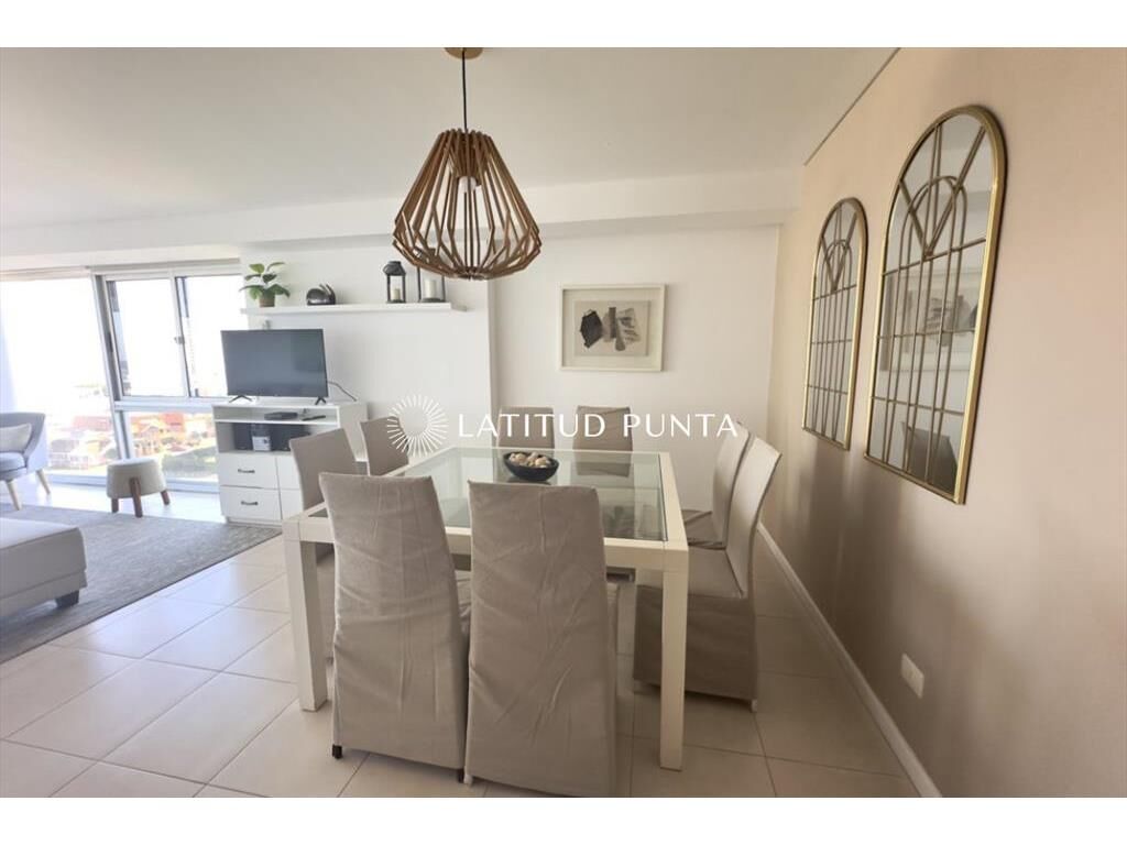 Excelente apartamento en piso 9 a una cuadra de Playa Mansa, con muy buena vista al mar y al Enjoy. Edificio con muy buenos servicios y cerca de la península. Living-comedor con aire acondicionado, cocina definida, 3 dormitorios, uno en suite, 2 baños completos más toilette. Terraza con vista al mar. Lavadero y garage.