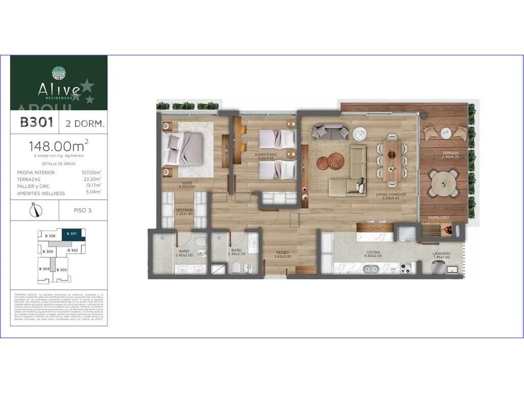 Living comedor con terraza al frente con parrillero, cocina definida con placares y terraza lavadero, 2 dormitorios, 1 en suite con vestidor, 2 baños completos. Cuenta con garaje y bahulera.