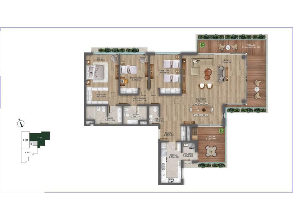 Living comedor con terraza al frente con parrillero, cocina definida con placares y terraza lavadero, 3 dormitorios, 1 en suite con vestidor, 2 baños completos y 1 baño social. Cuenta con garaje y bahulera.