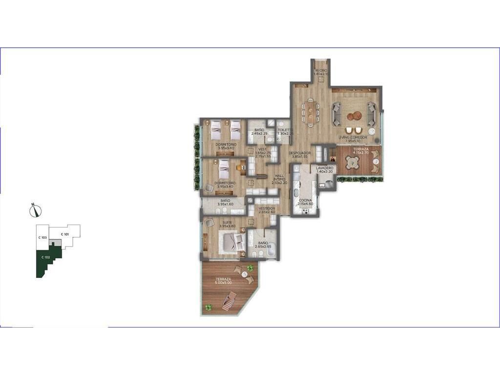 Living comedor con terraza al frente con parrillero, cocina definida con placares y terraza lavadero, 3 dormitorios en suite, 2 con vestidor, 3 baños completos y 1 baño social. Cuenta con garaje y bahulera.