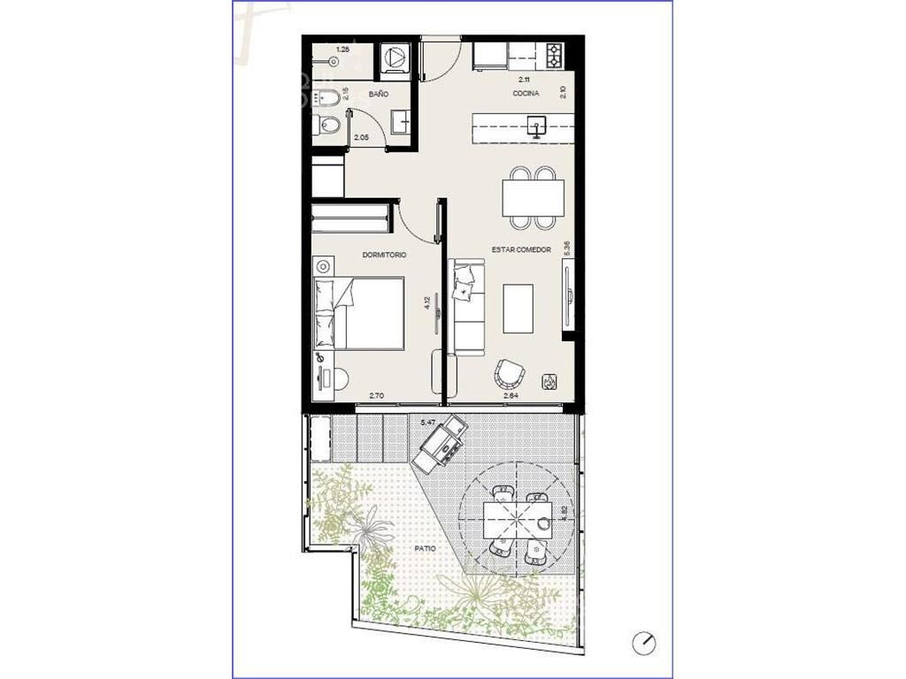 Living comedor con toldo vertical, cocina integrada con muebles sobre y bajo mesada, campana extractora de acero inoxidable y anafe eléctrico, previsión espacio para horno eléctrico, heladera y microondas. Placard para lavarropas. 2 dormitorios con placares, 1 en suite con vestidor, 2 baños completos.Patio de 45 m2. Estufa de alto rendimiento.